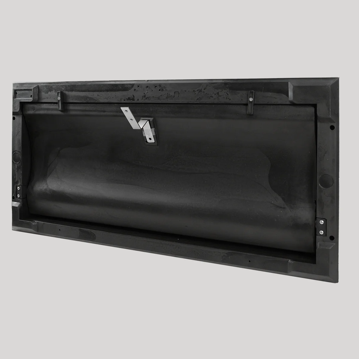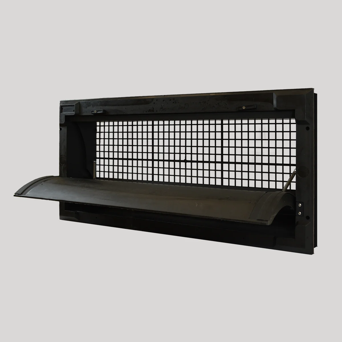 La unidad EAR es una entrada de aire diseñada para instalaciones ganaderas donde se requiere un control eficiente del flujo de aire. Su estructura está compuesta por un marco externo de 90 × 43,5 cm y un marco interno de 85 × 38 cm, lo que facilita su integración en paredes o cerramientos estándar.