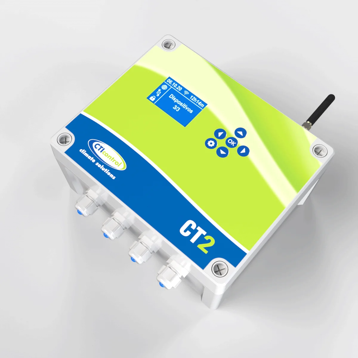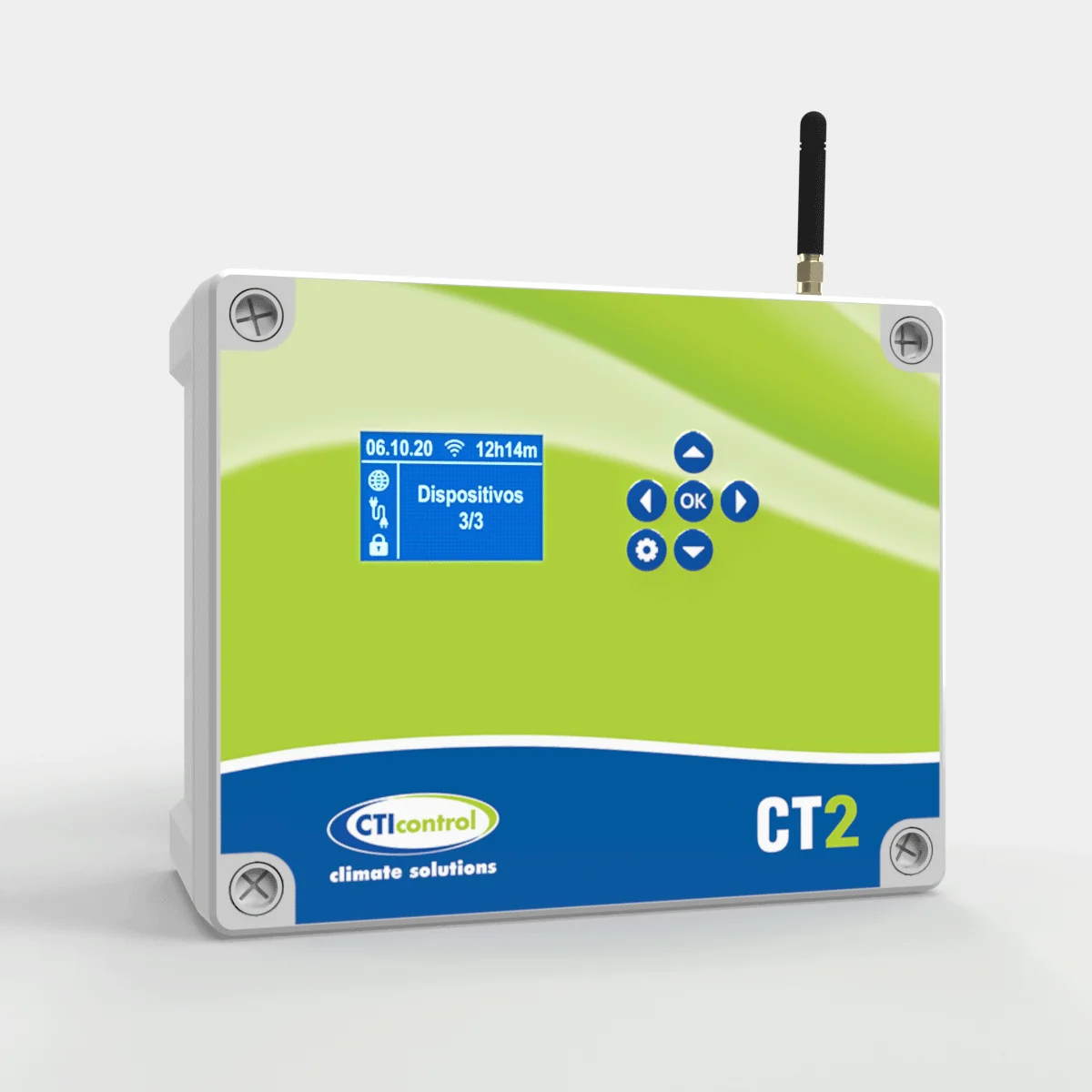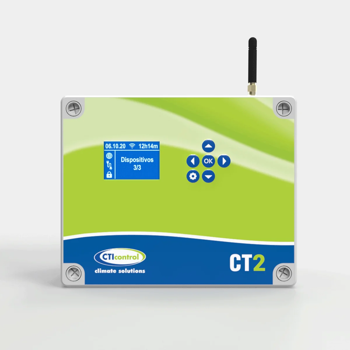 La central de comunicaciones CT2 permite el acceso remoto a los controladores de la granja mediante la plataforma CTIPORTAL, utilizando redes móviles 2G/3G o conectividad Wi-Fi. Su versatilidad de alimentación (230 Vac o 12 Vdc) y su capacidad de conexión lo convierten en el núcleo de comunicación de cualquier sistema agrícola inteligente.