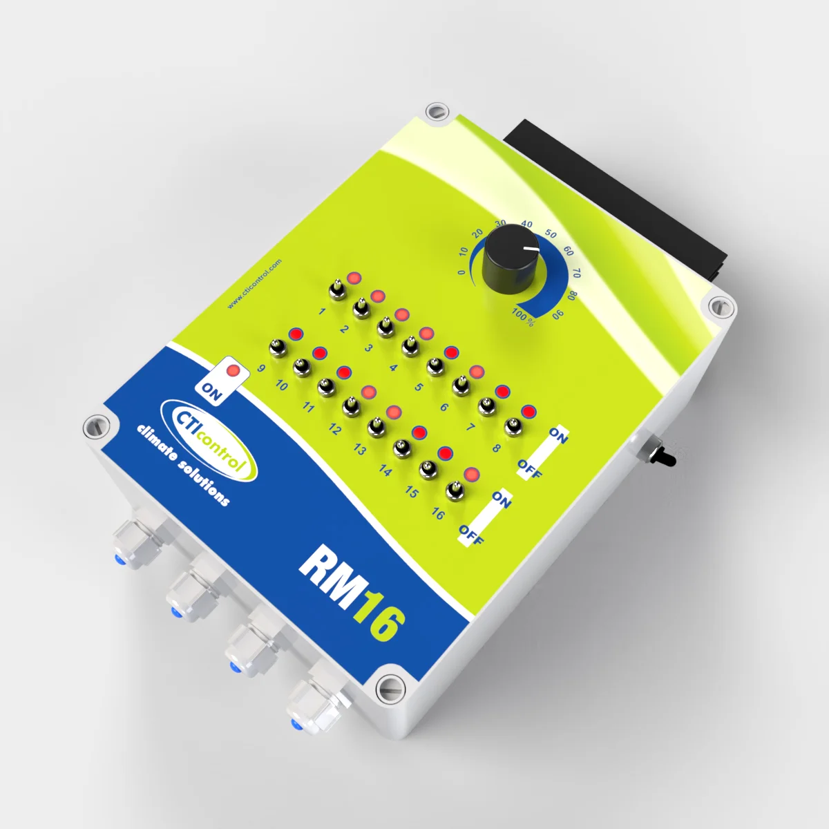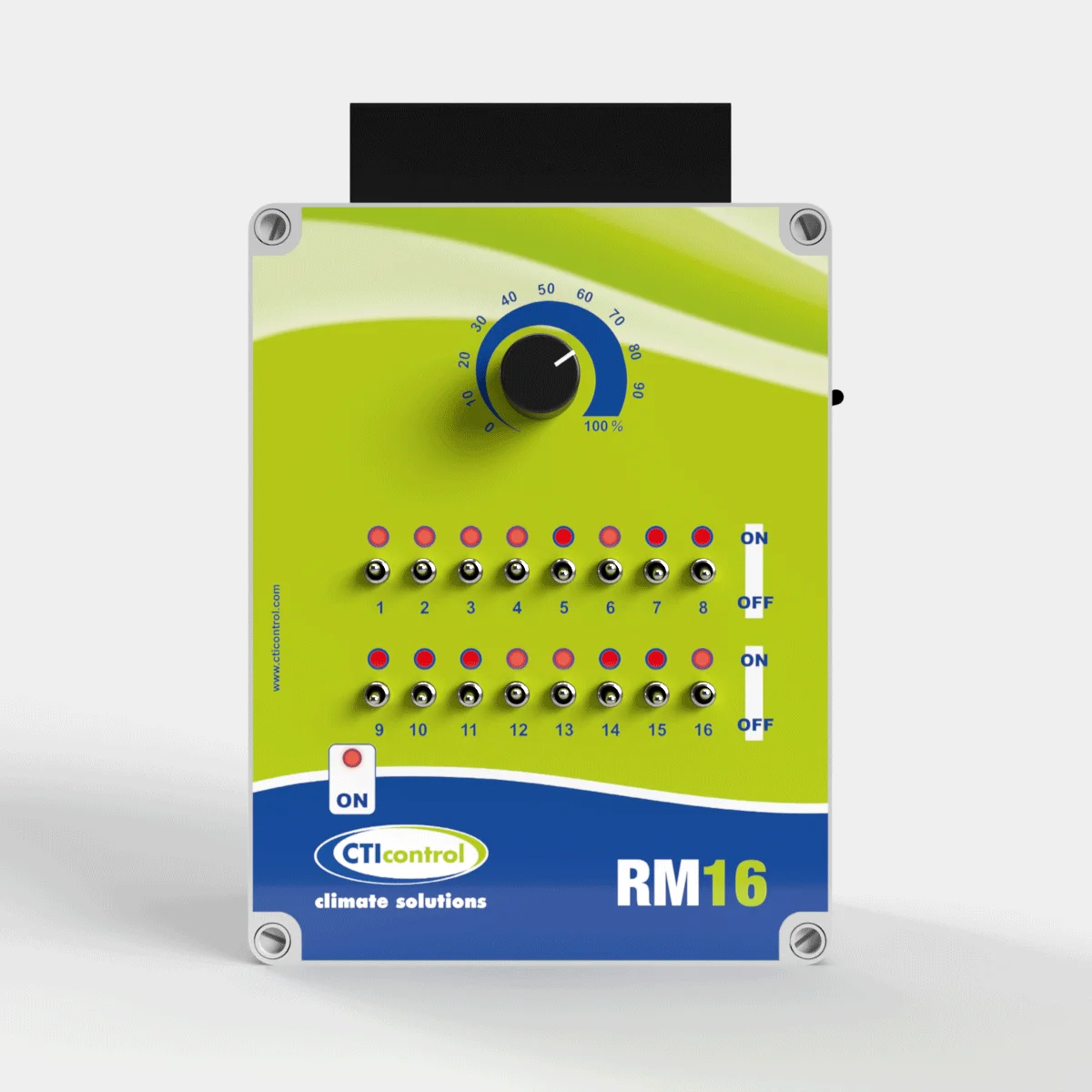 RM16 permite gestionar manualmente hasta 16 mantas eléctricas de forma independiente. Cada salida incluye un indicador luminoso que señala si la manta está activada. Pensado para entornos ganaderos que requieren un control preciso y simple del calentamiento individual de nidos.