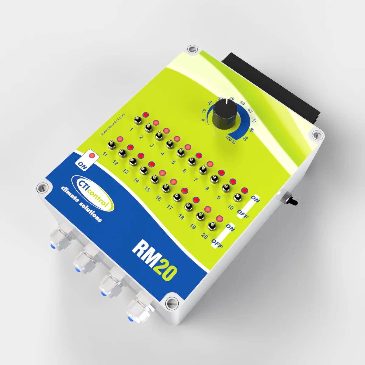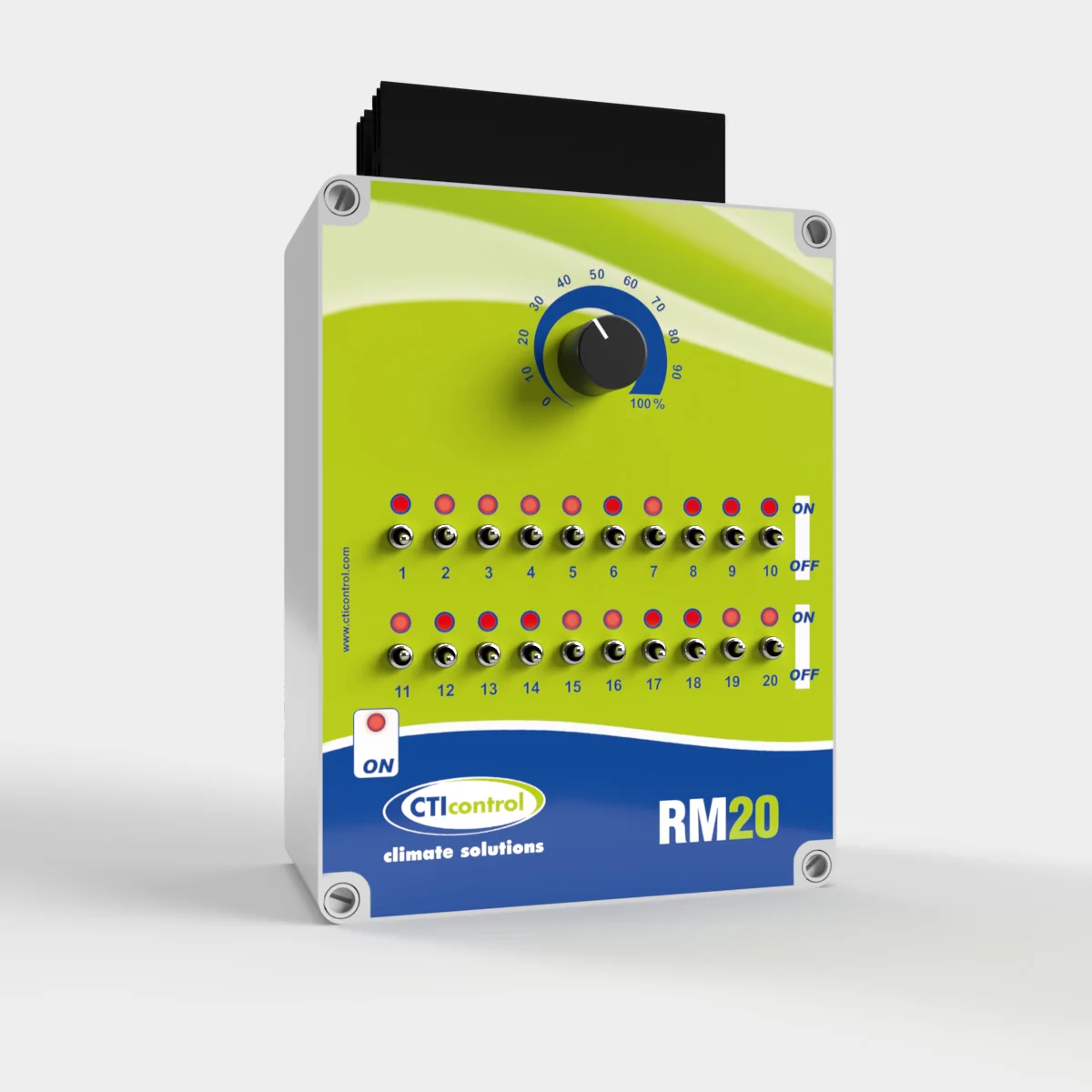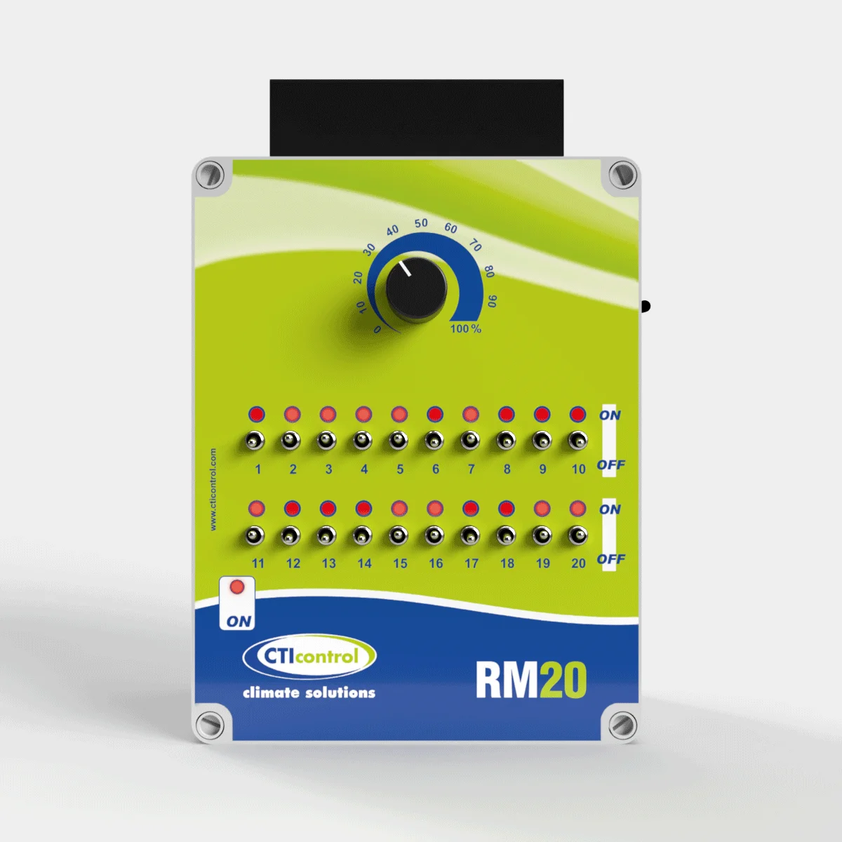 RM20 ofrece control manual individual de hasta 20 mantas eléctricas mediante interruptores dedicados y un potenciómetro central. Incluye indicadores luminosos para verificar fácilmente qué mantas están activas. Diseñado para un manejo intuitivo y fiable en instalaciones ganaderas.