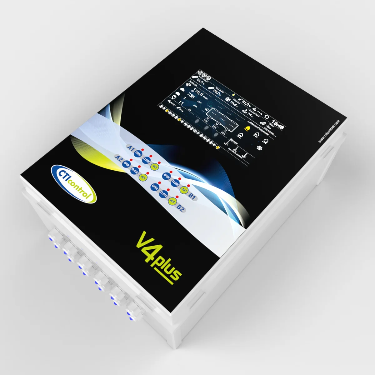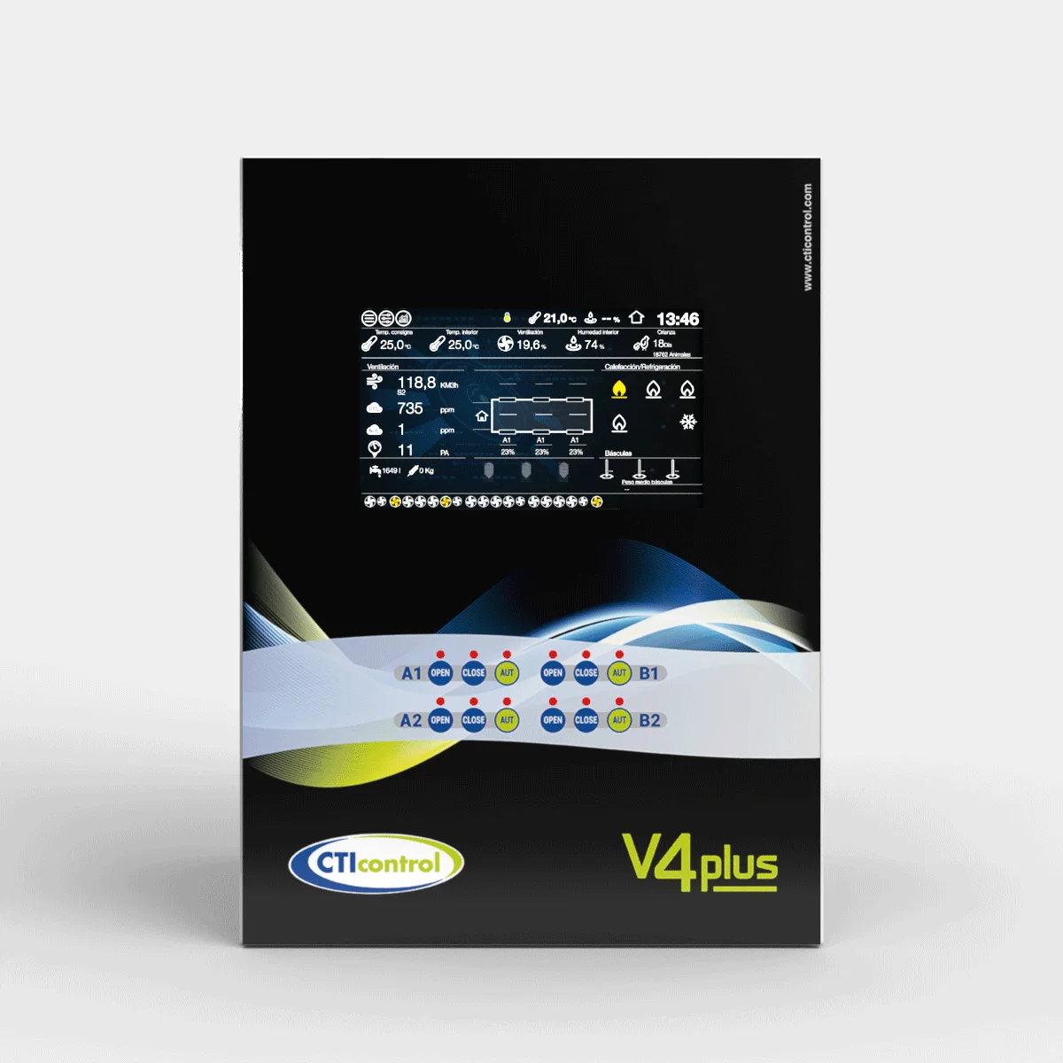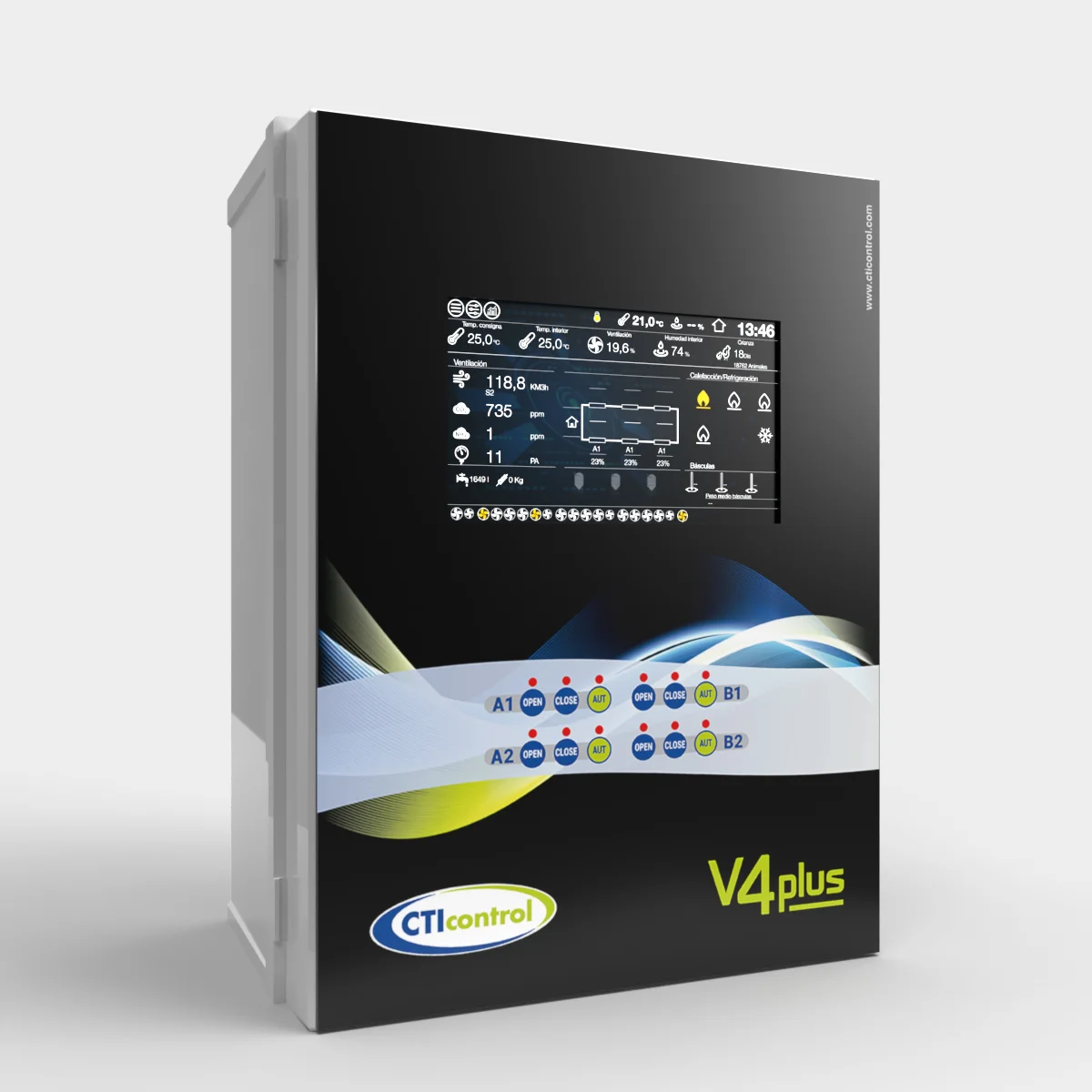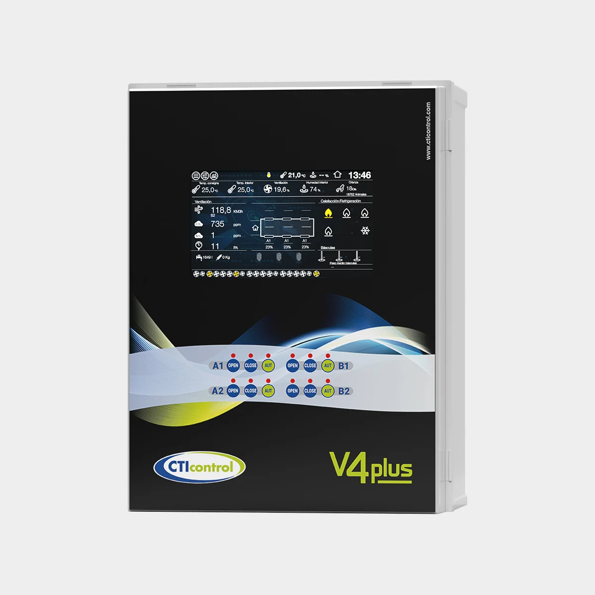 Controlador con pantalla táctil a color de 7’’ que permite gestionar hasta 12 etapas de ventilación y controlar directamente 4 motorreductores para entradas de aire o cortinas, más una salida 0-10V para cooling o techo.