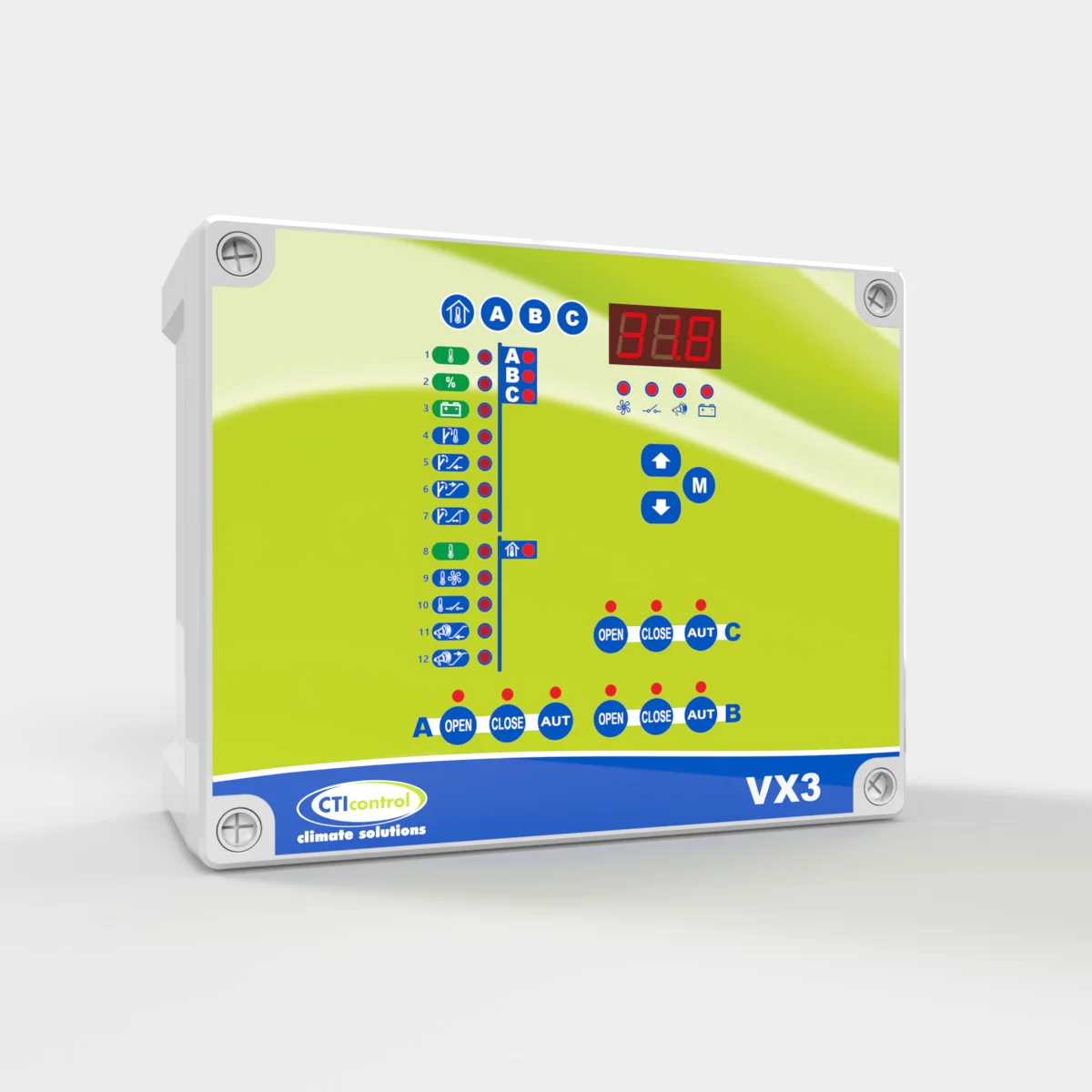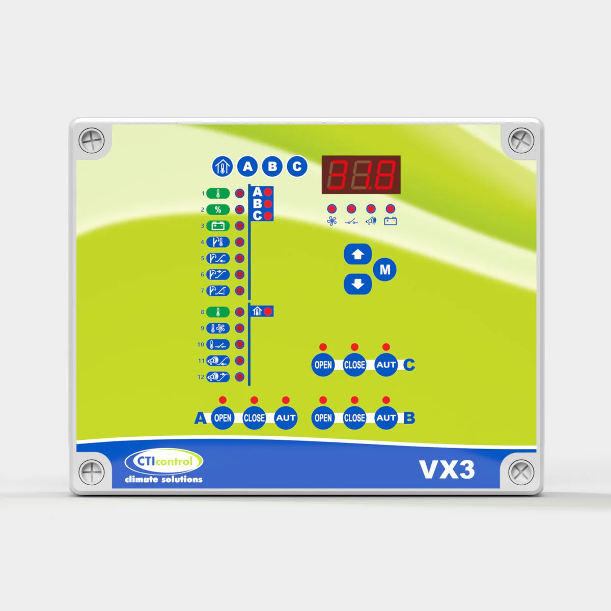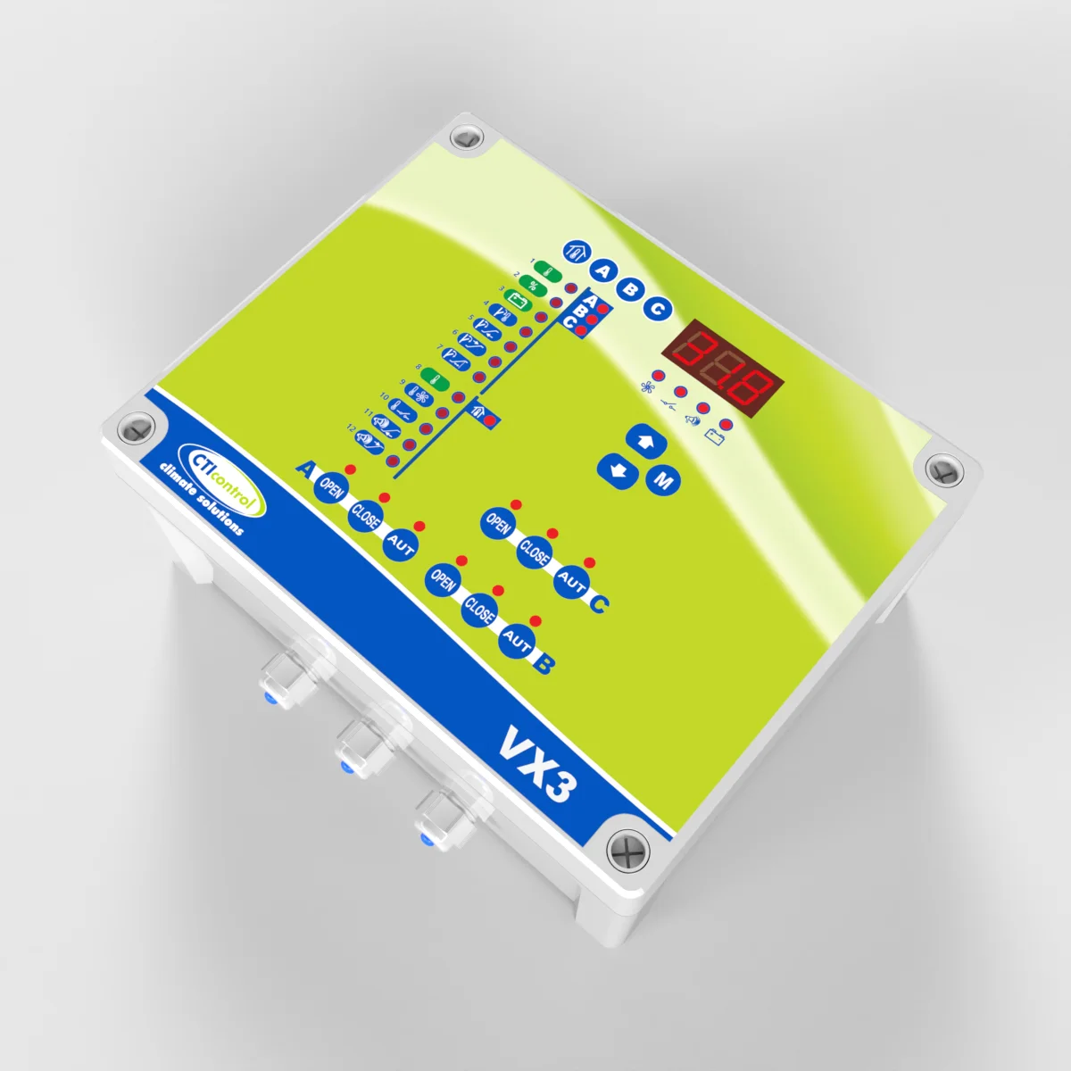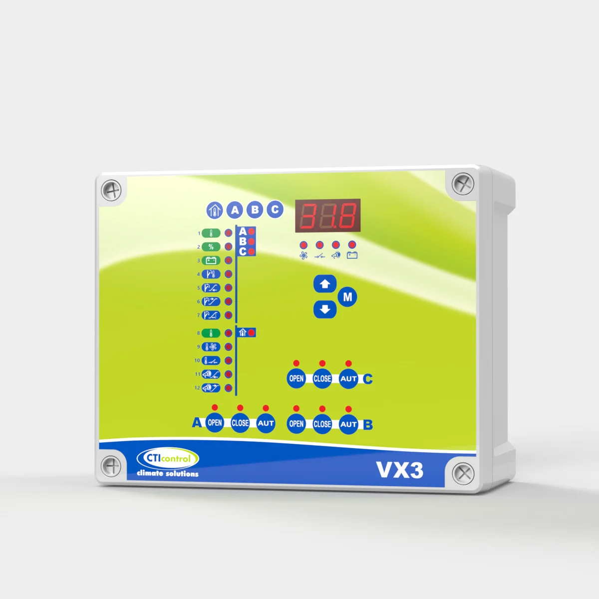 Controlador para gestionar motorreductores MRT10 y MRT20, con relé auxiliar configurable para calefacción o refrigeración y relé de alarma. Controla tres grupos de entradas de aire tipo A, B y C con ventilación mínima temporizada en modos todo/nada y progresivo.