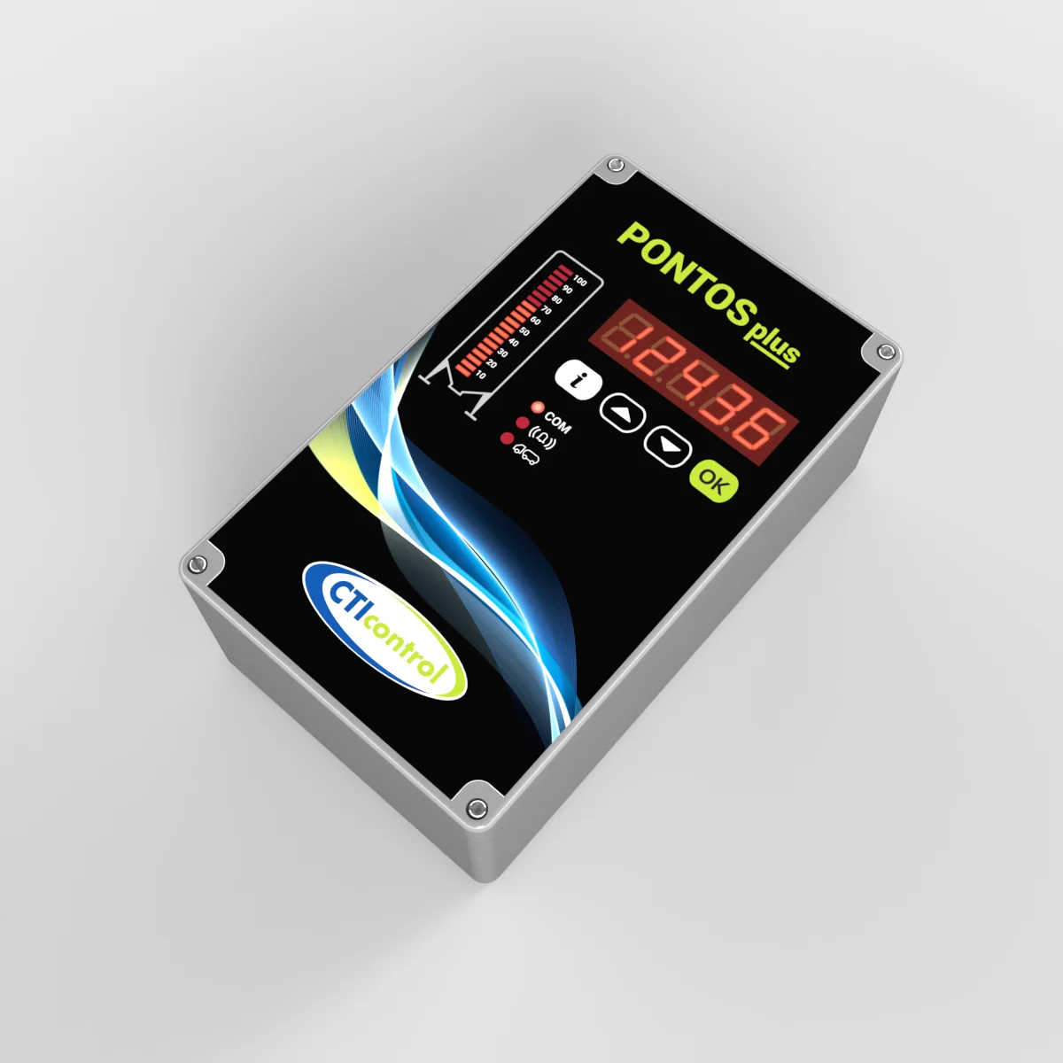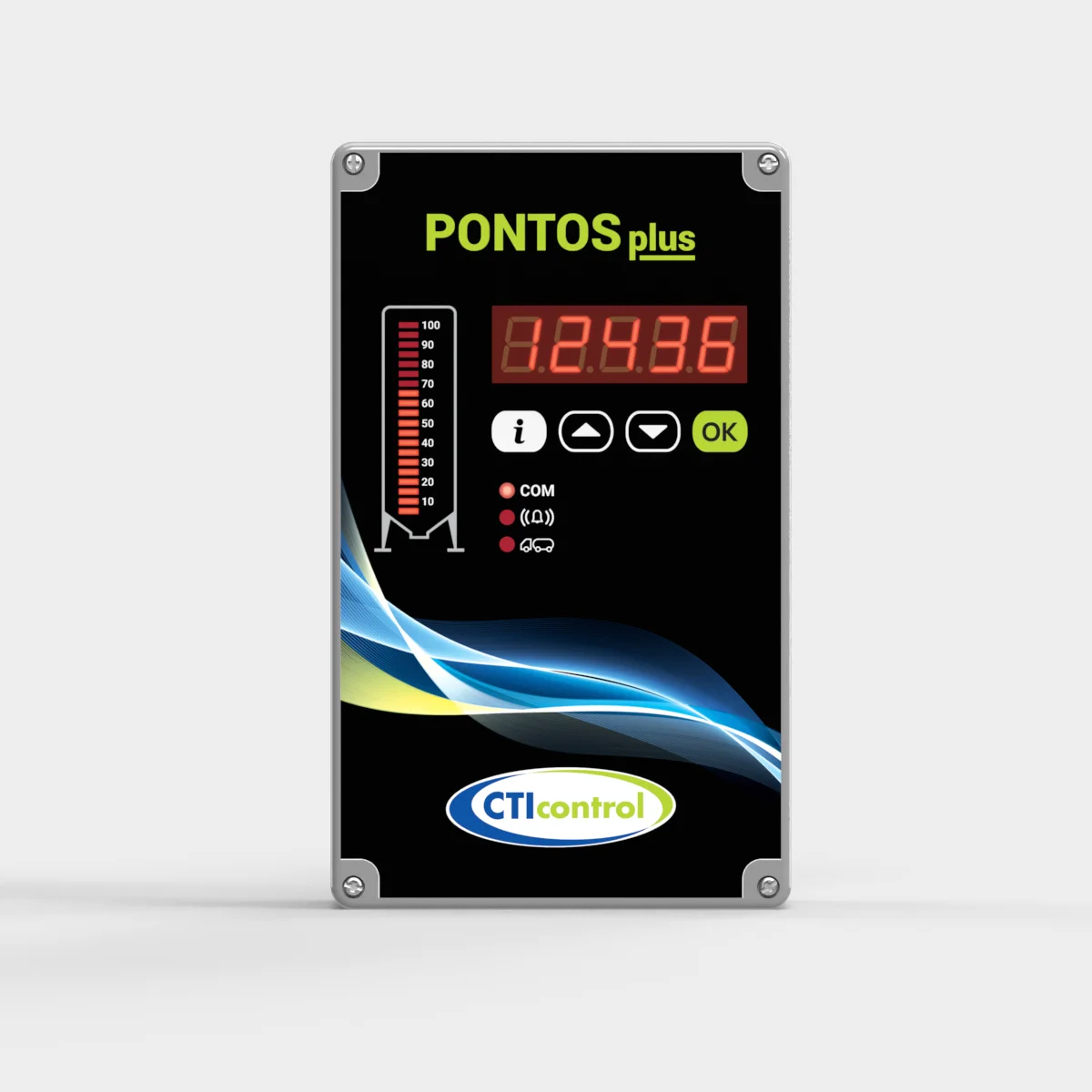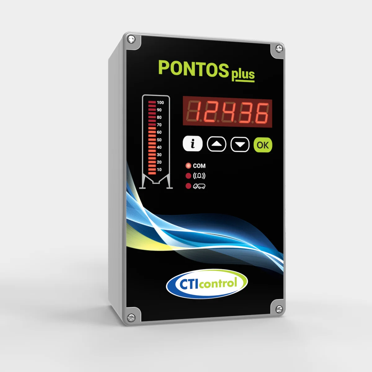 PONTOS Plus añade funcionalidad visual y conectividad al sistema PONTOS. Cuenta con pantalla integrada que muestra en tiempo real el peso exacto del silo y un indicador del nivel de alimento. Guarda automáticamente el historial de la última carga y permite configurar alarmas por nivel de pienso.